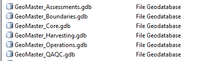 It is important to realise that GeoMaster does not limit the number of Geodatabases you might split your GIS datasets into, or what you can store in the Geodatabases together (e.g you could store just the patch layer in one Geodatabase and have other layers in another, or have them altogether in a single Geodatabase). Most of the considerations for doing so will be based around security of the GIS data, type and number of edit users vs number of read only users.